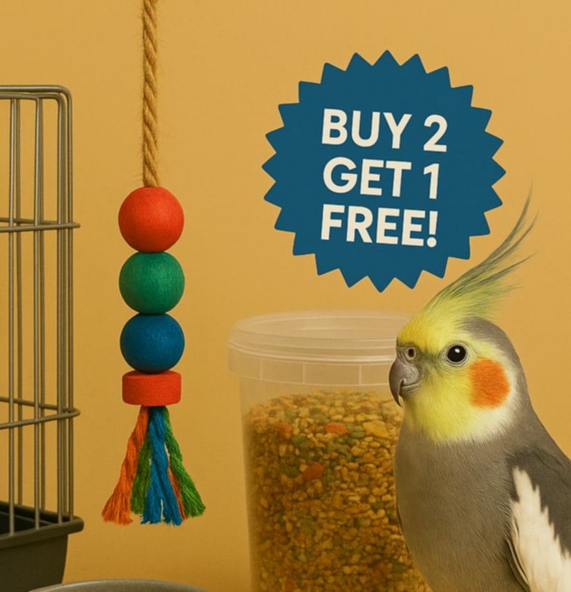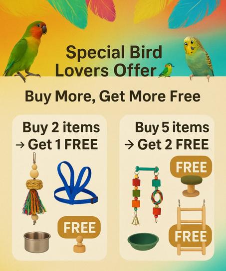 Celebrate your love for birds with our exclusive KikoBirdShop promo showcases a variety of bird toys and accessories, featuring a Buy 2 items โ Get 1 FREE deal and a Buy 5 items โ Get 2 FREE deal.
